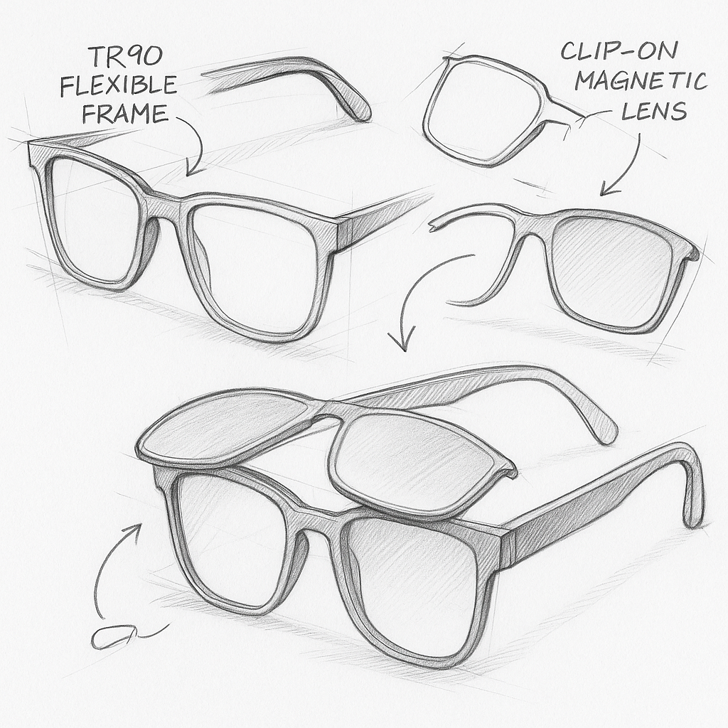 Our focus today is on magnetic clip-on sunglasses — smart, interchangeable eyewear that adapts to your life with a single click. Clear lenses for everyday use, polarized UV400 clip-ons for sunlight, multiple styles for different moods and moments. One frame. Many possibilities.